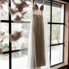 Embellished with beading and sequined lace, this classically beautiful A-line gown features a soft crepe chiffon skirt.