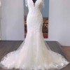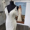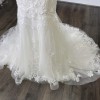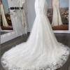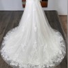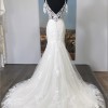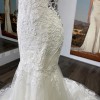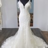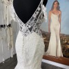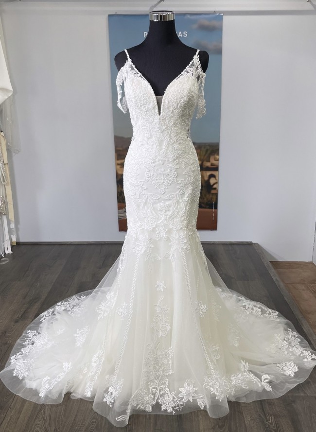 Stunning wedding dress with unique lace motifs over sparkle tulle. Illusion side lace cut outs. Deep illusion V-neckline. Illusion lace V-back. Lace spaghetti straps with detachable off shoulder sleeves. Lined with stretch jersey for comfort. Covered buttons over zipper closure.