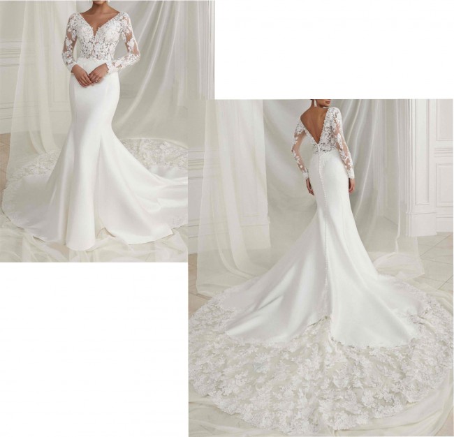 You will turn heads and be the most beautiful bride in this dress! ❤️🥰✨This dress truly checks all the boxes.. modest yet sexy, elegant, all in a timeless silhouette. Such a stunning , elegant, and flattering dress with a breathtaking train. wore for only a couple of hours, dry cleaned+ ironed/ fully steamed and in excellent, perfect condition! Unaltered size 10 by Justin Alexander.