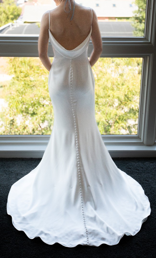 Van Der Velde description: This gorgeous clean gown features luxurious satin back crepe with a delicate bodice draping. It is finished with a beautiful cowl back neckline.
