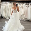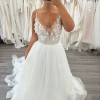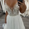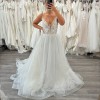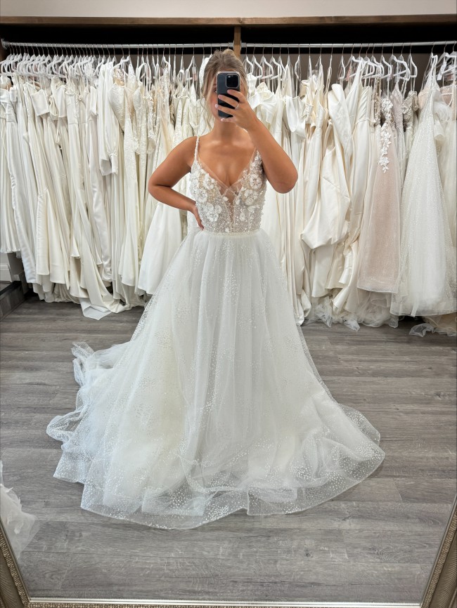 Ex-Sample wedding gown. A-line ivory gown on straps with sequin embroidery and open back. The gown has a sheer cape made of tulle also embroidered with sequins.