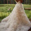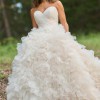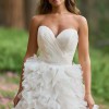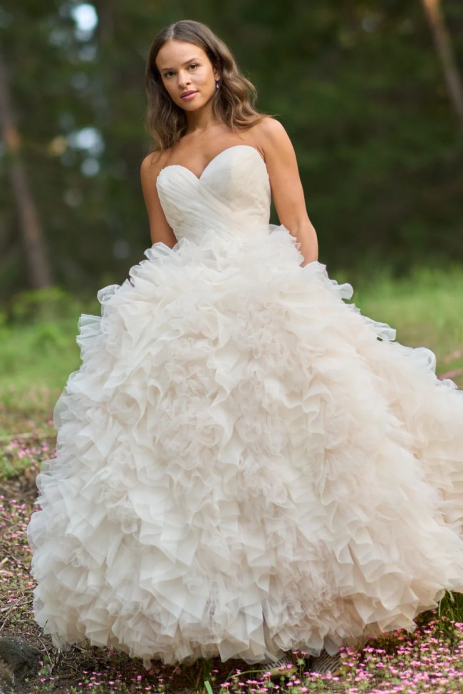 A romantic ivory A-line wedding gown with gorgeous ruffles adorning the skirt. Sweetheart neckline, pleated tulle bodice, delicate beaded belt. Zip and button back enclosure.