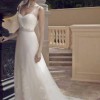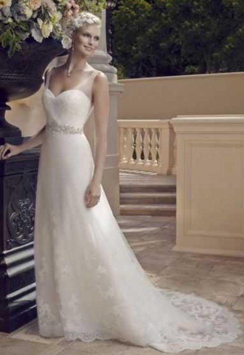 Unique gown features a fitted A-line satin silhouette under a sheer layer of organza and a layer of tulle that has delicate non-beaded lace appliqués at the bottom of a full A-line shaped skirt adorned with scalloped hemline, creating depth between the two layers.