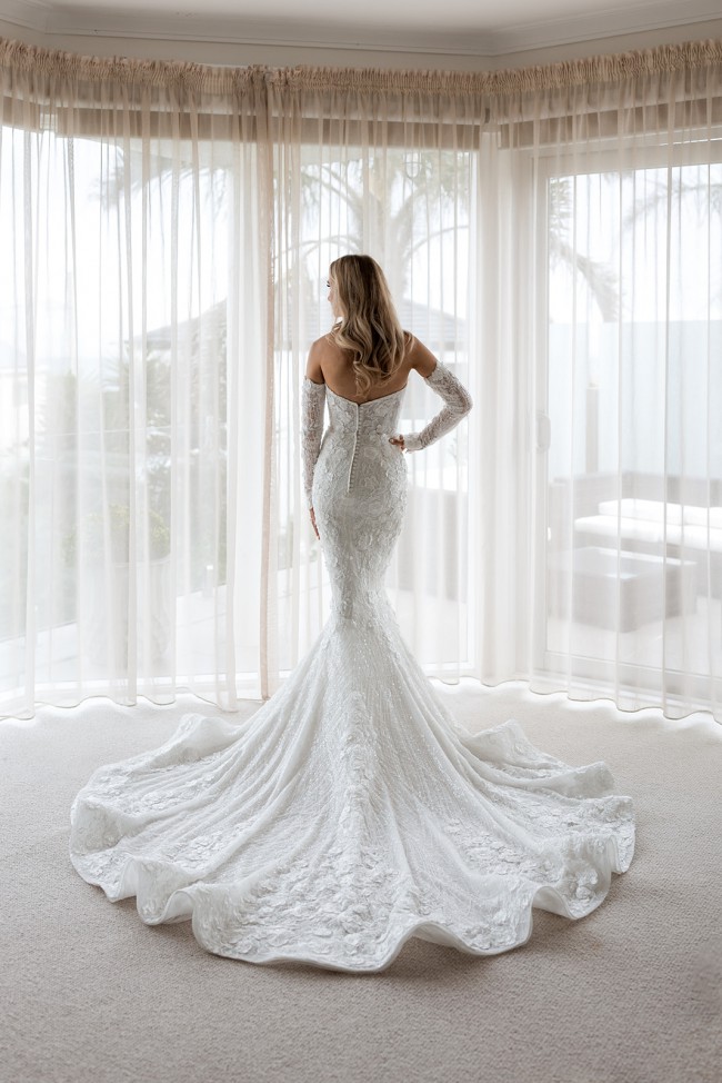 The matching off-shoulder long sleeves offer a sultry touch, with the beading, florals, and lace trickling down your arm. For our brides whose weddings are in the warmer months, you have the option of changing our long sleeves to an off-shoulder strap instead