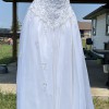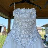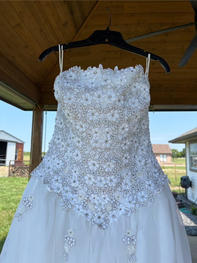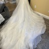 Eve of Milady dress style 6060 size 16 purchased in Missouri in 2001 for outdoor wedding. It was professionally cleaned and then sat in my climate controlled closet for the last 23 years. The dress is in excellent condition, the detachable train (attaches at waist) has been folded up and needs to be straightened before use. The train is 10 feet long and gorgeous when fully fluffed out. This train made me feel like a princess and I loved it! The dress was altered to fit me, primarily in the bust and slightly in the waist in 2001. It is white and beautiful. I have loved it all these years but realize I do not have anyone who can benefit from it down the line, so happy for someone else to enjoy it or make it their own.