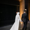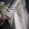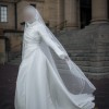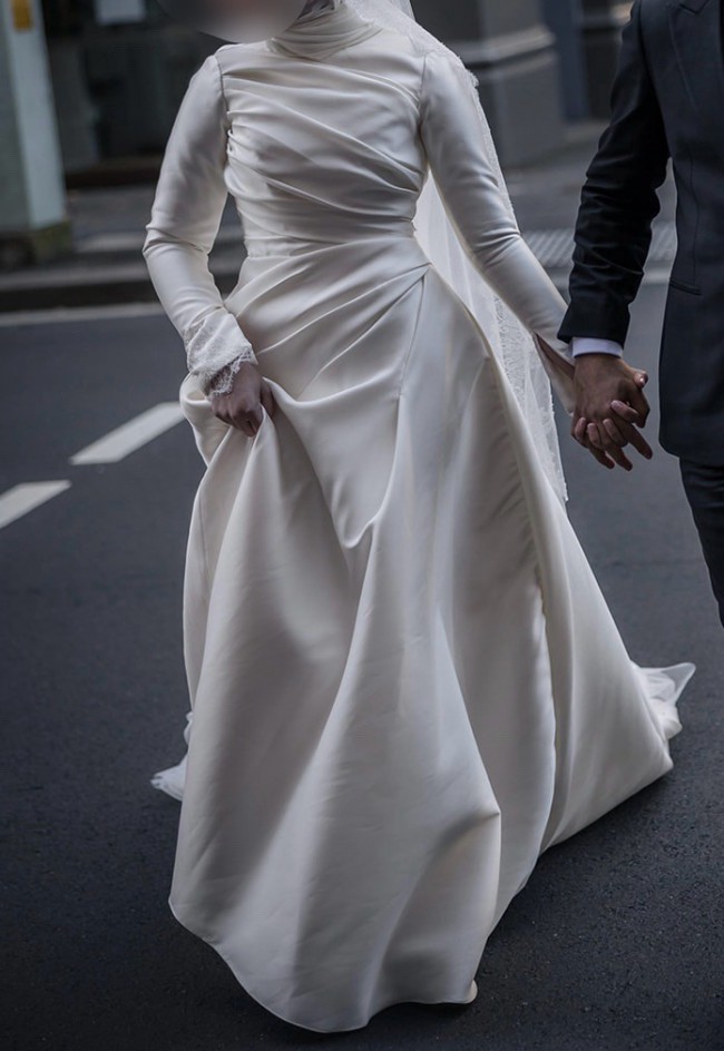 A custom made I AM YULITA wedding dress featuring long sleeves, high back and a full length align gown with a 2m train. It also has a structured collar with a high neckline.