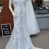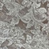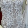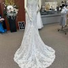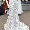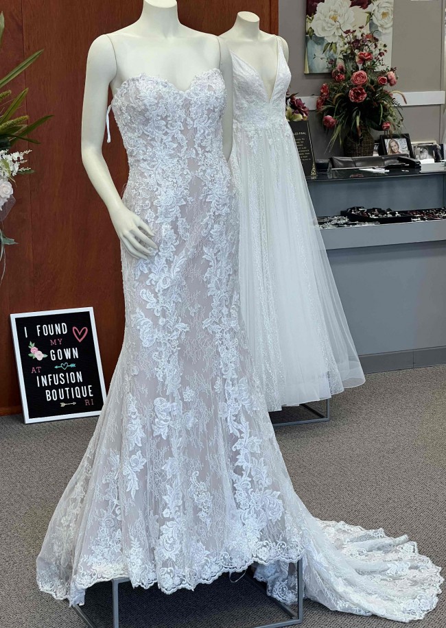Allover Chantilly Lace Fit and Flare with Beaded Embroidered Lace Appliqués. A classic style gets a glamorous upgrade. This stunning allover lace fit and flare gown features hand-placed embroidered lace details to highlight and complement your most feminine features. Color is Ivory over Nude.