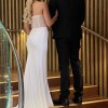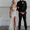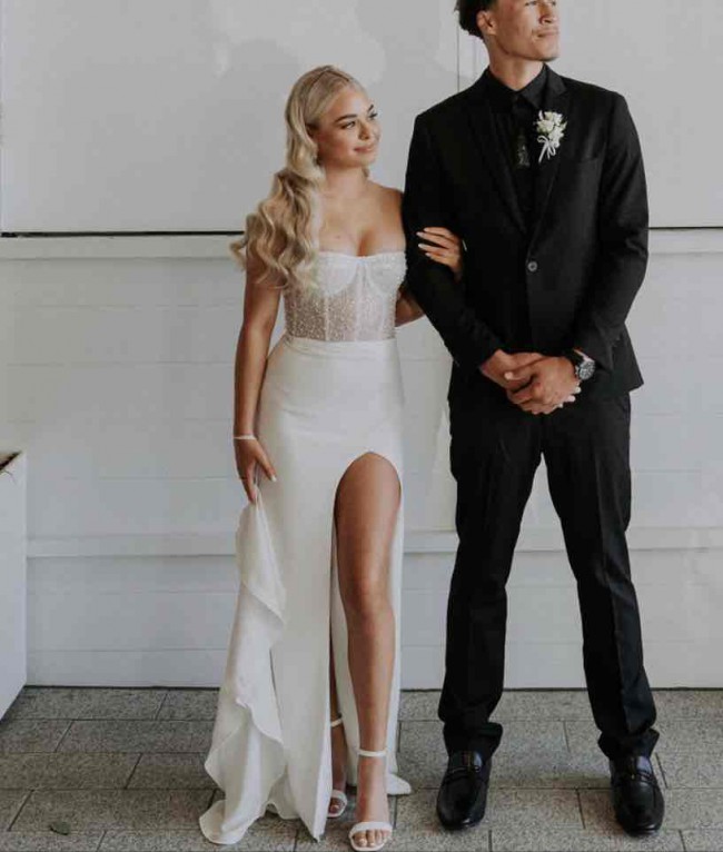 Small pearls on bodice with sparkle. High front curved split.