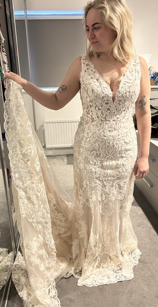 Never worn for a wedding, only worn for a fitting. Has been altered, bought as a size 12 but now fits a size 10. Has been kept in excellent condition. A very comfortable, figure hugging dress that deserves to be worn for someone’s special day! Open to offers.
