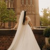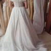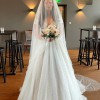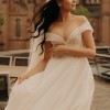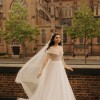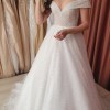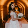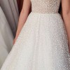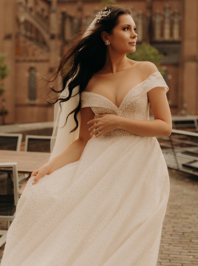 This wedding dress exudes a timeless, classic beauty, ideal for a fairytale wedding. Crafted from a special material that shimmers like a thousand diamonds in the dark, it captivates with its elegant charm. The dress features an invisible mesh, ensuring a secure fit on the shoulders while maintaining its graceful off-the-shoulder style. A hidden corset allows the dress to be adjusted between sizes 36-38, accommodating a cup size up to C, with no issue for smaller sizes. Remarkably comfortable and lightweight, the dress features a train that can be gathered and fastened at the back with a button, adding convenience to its exquisite design. Additionally, a hoop skirt is included to enhance the dress's silhouette.