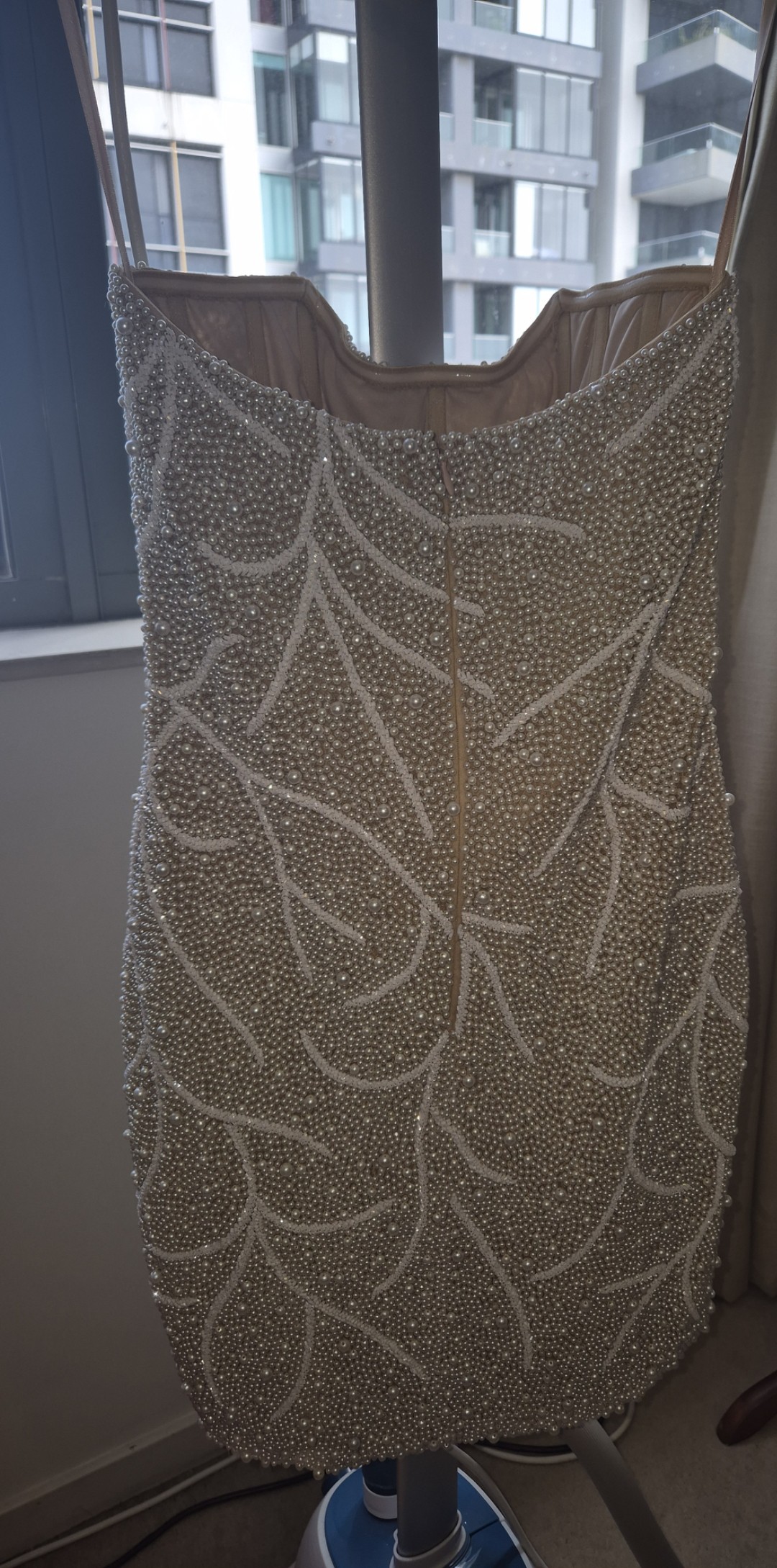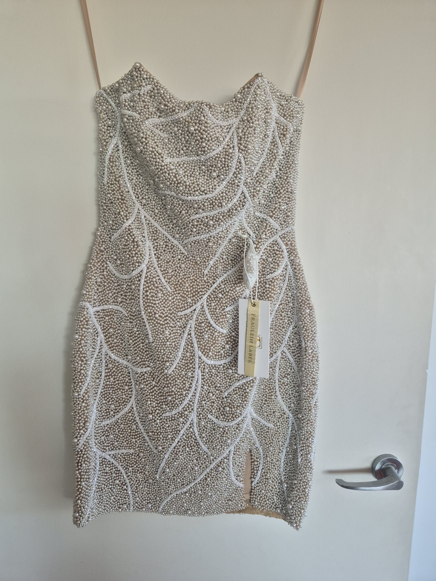 Sold out online. Brand New Never Worn (Only Tried On) end up going with the gown version. This is a one of a kind piece, handcrafted luxury mini dress, fully hand-beaded with hundreds of pearls and crystals. It took over 85 hours to complete using intricate couture techniques. The dress is designed with built-in boning and padded cups for structure and support, and the fabric has stretch to comfortably fit US sizes 4–6. It’s a true statement piece elegant, rare, and made to turn heads. Perfect for a reception, engagement party, or any event where you want to shine.