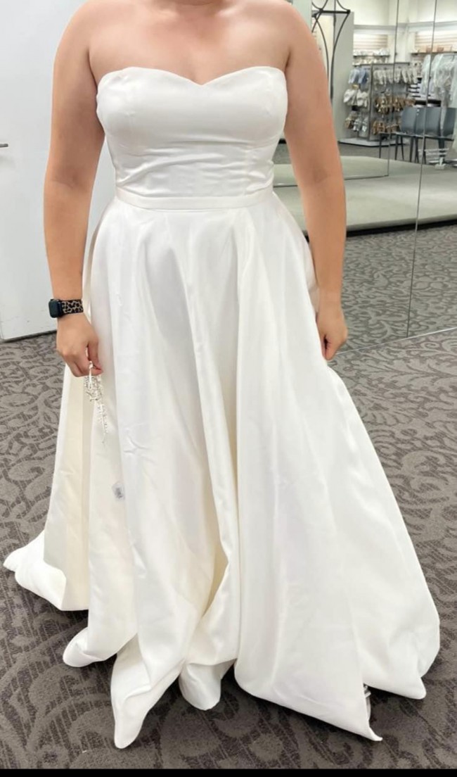 Brand new strapless David’s Bridal wedding dress. Never worn, no defects. No alterations to the dress were made. Material is satin and color is ivory. Has pockets and a slit up to thigh area. The strapless bodice is expertly crafted to provide a flattering and secure fit, ensuring that the bride can move with ease and grace. The sweetheart neckline adds a touch of romance, accentuating the bride's natural beauty and radiance.