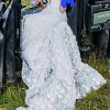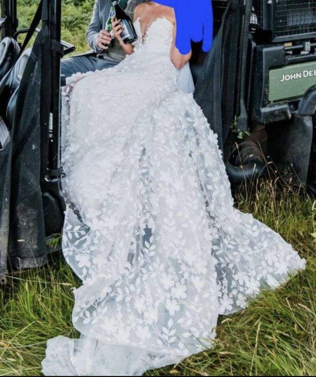 This is not in perfect condition so is for a bride who wants to grab themselves a bargain or dress seller who fixes up and sells on for profit rather than someone looking for a pristine dress. The bottom of the dress more so than the train is muddy so whoever has it would either need it dry cleaned or ideally taken up. There are also petals/leaves on the dress which look like they have water marks (I've added one as example) in my opinion not noticeable unless up close but again something to consider that your seamstress may want to take some petals and move them to other areas .