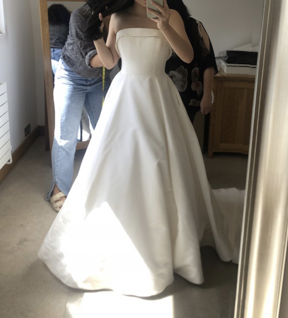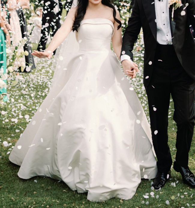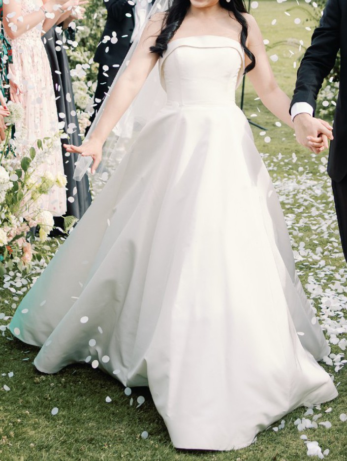 The bodice band, originally designed with a twist, was professionally adjusted so it now lies flat and straight for a cleaner silhouette. At the back, the band sweeps into an asymmetrical bow, creating an elegant, architectural detail.