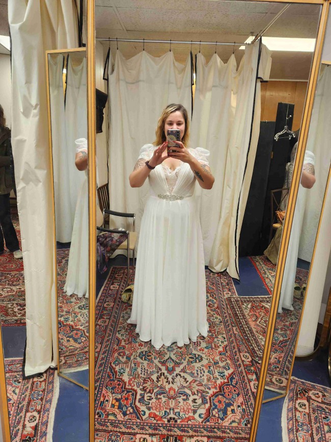 Dress has never been worn. Selling because I ordered a size 12 when i should have sized up (dress im wearing in the images is the sized up version) The back has a hidden zipper. The dress is amazing quality!