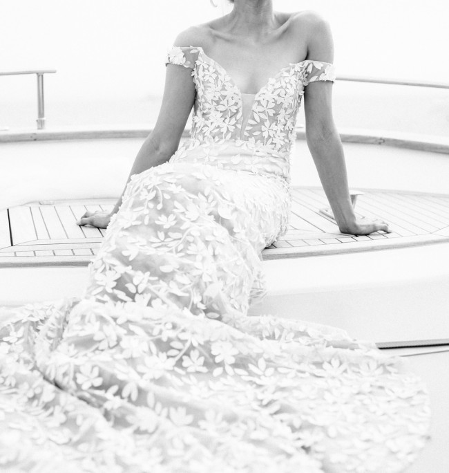 Darcy’s statement 3D floral lace is truly a show-stopper! This gorgeous, feminine design features a highly-requested cap sleeve with concentrated floral applique and our iconic, daring MWL plunging neckline. Darcy is perfect for brides looking to make a statement on their big day. Her figure-hugging pattern features a flattering godet in the skirt and the perfect low V-back.