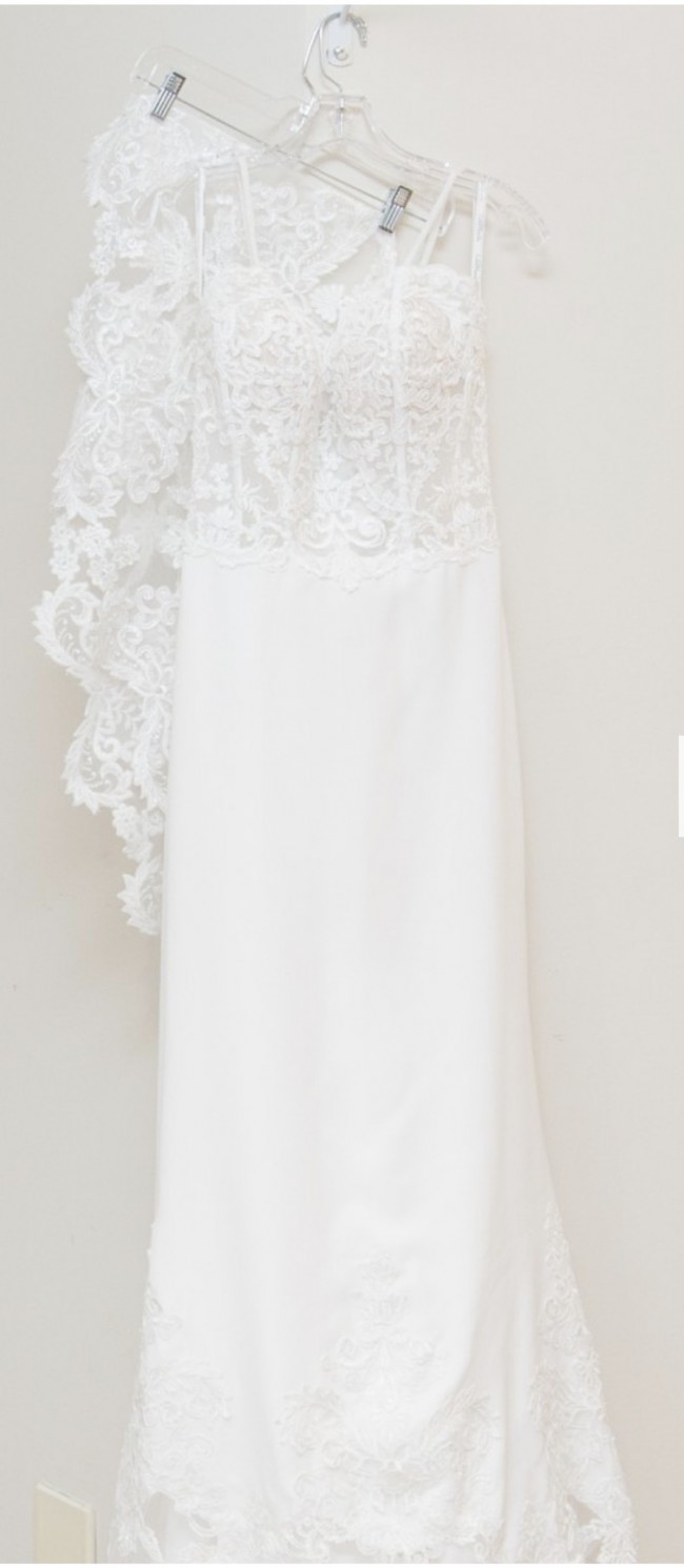 This stunning Calla Blanche wedding dress, worn only once, is ready for your wedding day. A bustle has already been added, making it ready to go for both your ceremony and reception. Brought the dress from another bride and never wore it. There is a little staining under the straps from maybe a spray tan but is not noticeable if worn and priced considering it has not been dry-cleaned. No other stains or rips found and overall in good condition. Dress should fit anyone size 2-6 with minor alterations. Feel free to reach out with any questions. Dress will come in dress bag.