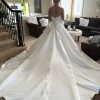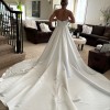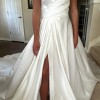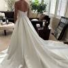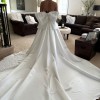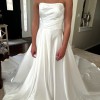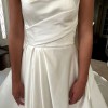 This elegant satin A-line wedding dress demonstrates timeless beauty. Never worn outside of a fitting, it remains in near-perfect condition, with only the faintest hint of discoloration on the inside lining from being tried on. This dress has had no alterations, giving you the flexibility to tailor it exactly to your needs.
