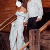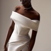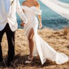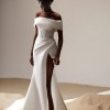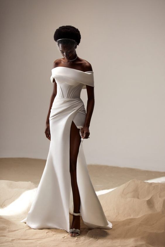 Stunning satin wedding gown in ivory with an off-the-shoulder corset and a side slit. I'll throw in my beautiful vail too :)