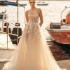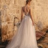 The A-line silhouette is elegantly enhanced by a layered skirt featuring dainty floral-detailed godets, which provide added fullness and movement. Scattered floral appliqués across the skirt infuse the design with a delicate, yet captivating texture. The sheer illusion back adds an element of modern allure, creating a sophisticated contrast to the floral details on the skirt.