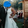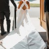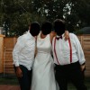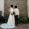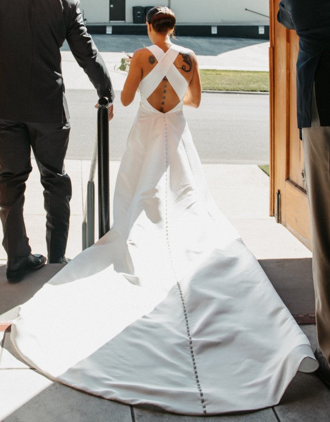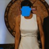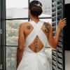 Gorgeous dress white satin dress with pockets! Criss-cross back, long train. Super comfortable from the ceremony to the reception. Alternations included sewing on bead/crystal belt (removed for dry cleaning but will be included with sale)' thinning out the tulle under the skirt of the dress to create a leaner silhouette, and taking in waste and straps. Bustle hook and button sewn into the back.