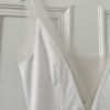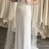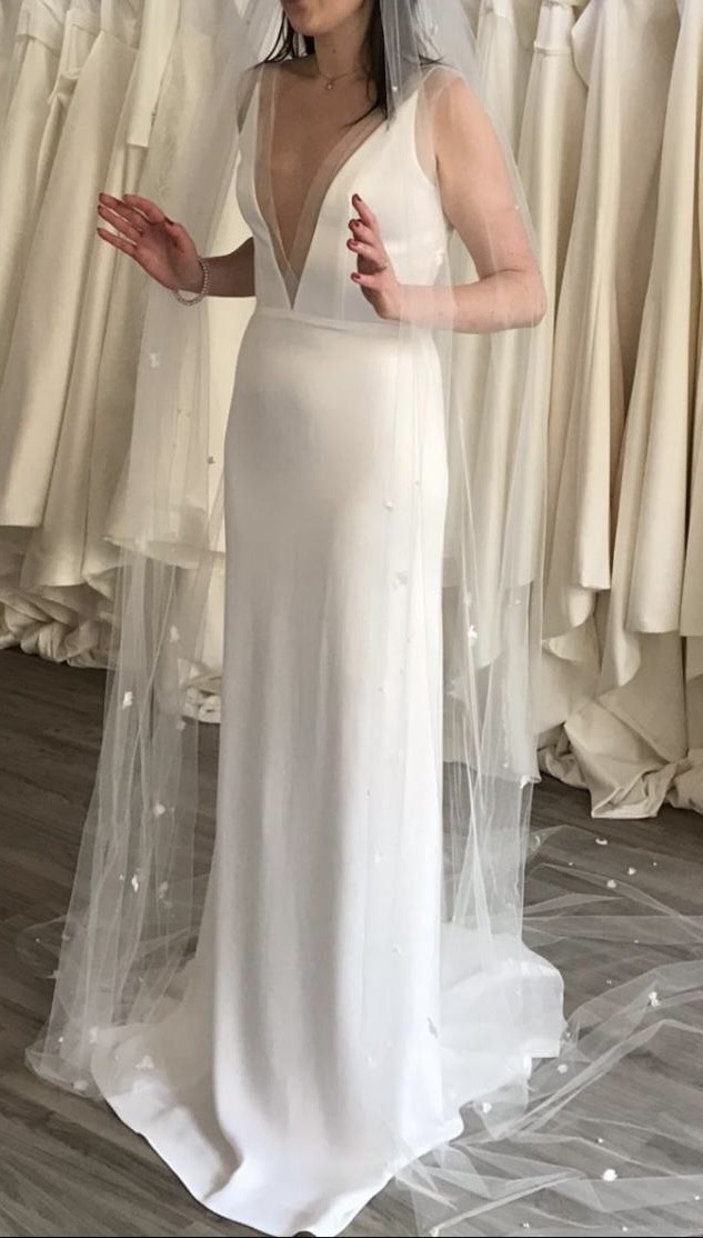 Stunning fit and flare white wedding gown by Sarah Seven in a beautiful drapey satin crepe fabric.