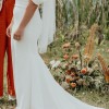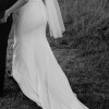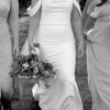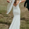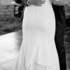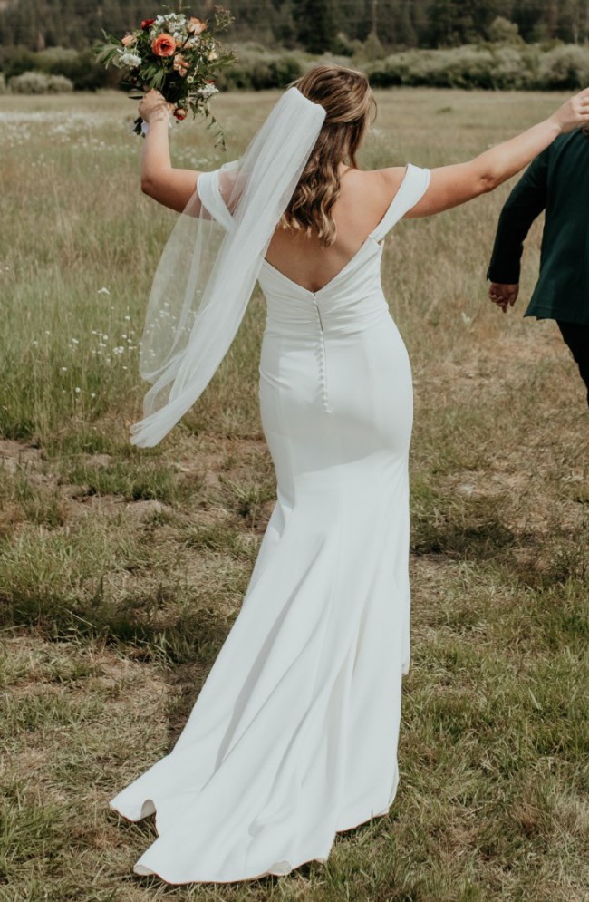 The dress is an incredibly soft, body-hugging and forgiving fabric. The dress feels elegant and timeless, and the sleeves can easily be detached if desired (the bodice has enough boning to support strapless). The back has a slight 'V' and is incredibly elegant without being too revealing. The ruching in the bodice are perfectly forgiving and timeless.