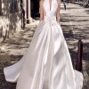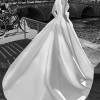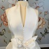 This chic Mikado ballgown features a high Mandarin collar, a V-line neck, and covered button and bow details on the front.