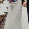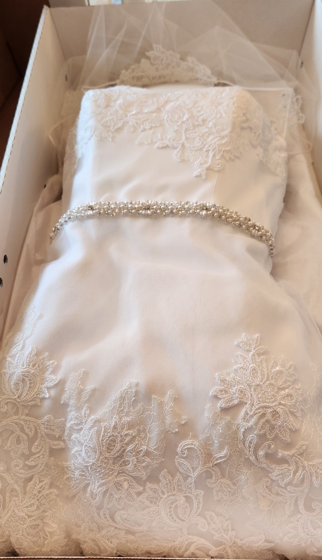 The veils name is Farrah and is being sold with it. The veil comes with a blusher and the back portion is fingertip in length. The veil was $400 new The gown was $1600 new. The gown and veil were cleaned and preserved immediately after the wedding and have remained sealed until today August 22, 2024. It remains in the box and the outer box for protection.