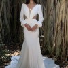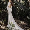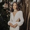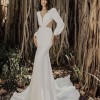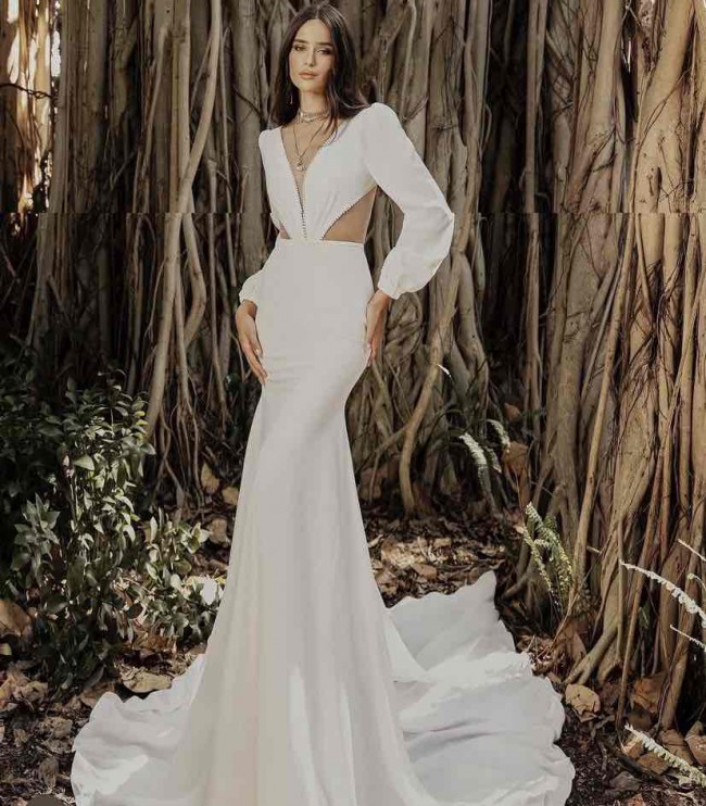 Tansy Crepe in timeless soft crepe is for the daring minimalist bride! This incredible gown features a plunging neckline, dramatic cutouts at the waist, and a unique extra low strappy back and button embellished skirt. The subtly voluminous sleeves add a romantic touch, while the beautiful train makes for an unforgettable entrance and exit. This gown is the perfect canvas for accessories.