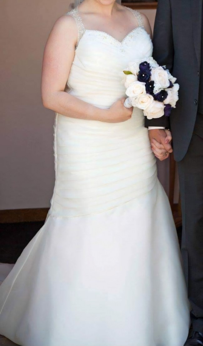 Size 18 Ivory Marc Lesley Wedding Dress. Beaded neckline, keyhole back with beading. Ruching on top, flare on the bottom. Has a mark on the front from storage but had been dry cleaned. I got married in 2015 so it's been in storage since.