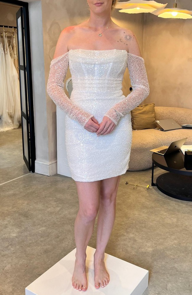 Alexandra was designed for the ultimate MWL Girl. She is made from the iconic made with love beaded Lola lace and features a corset top which fits like a glove thanks to its structured, internal boning. Her sheer sleeves and fitted mini skirt are perfect for the bride who wants to add a little glamour to their day or night. Alexandra is perfect for your engagement party, hens night or for a fun second look on your big day!