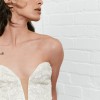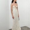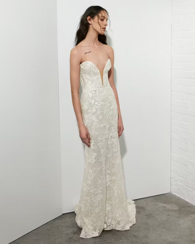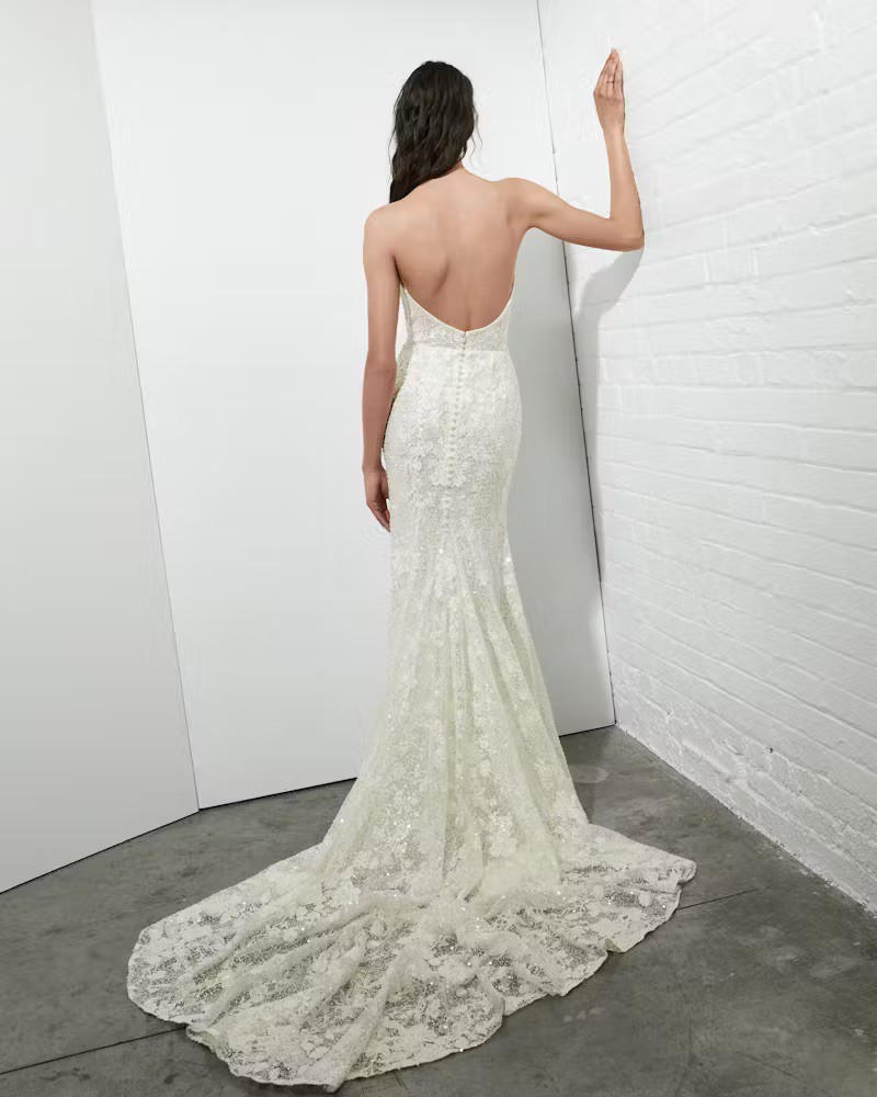 Dress details: Strapless embroidered and beaded shimmer lace sheath with plunging sweetheart neckline, finished with pearl buttons down back