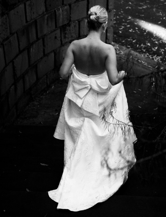 The dress boasts a unique and elegant bow at the back and a distinctive fold at the front, setting it apart with its one-of-a-kind design.
