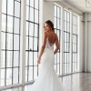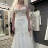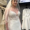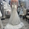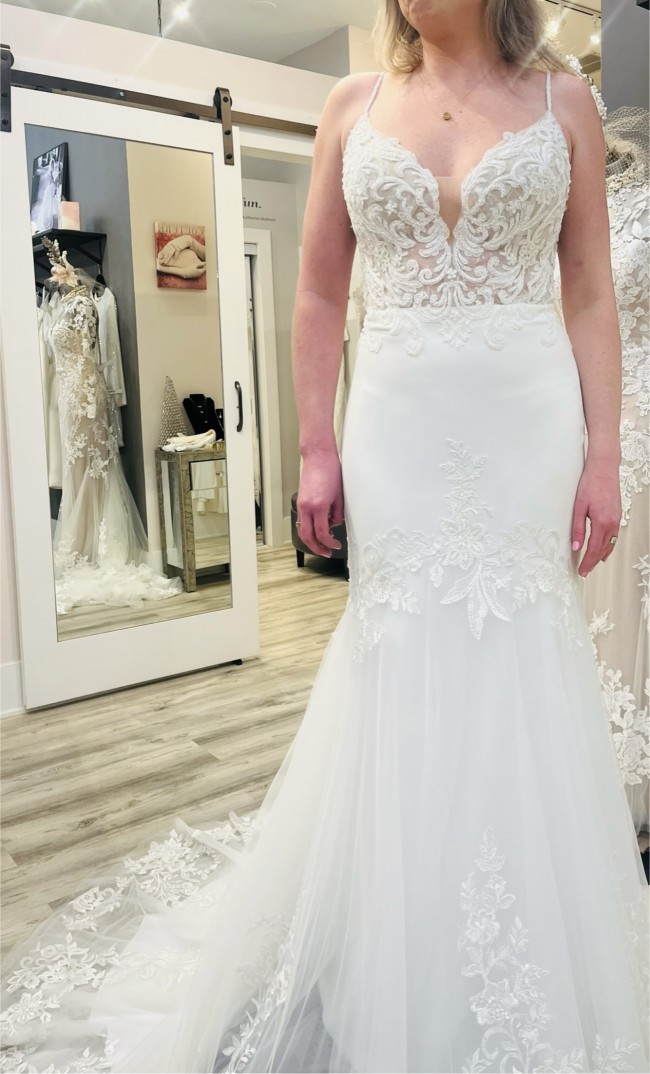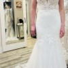 Beautiful and elegant. This dress has it all: with tulle , laces & embroidered details and flattering neckline! Never worn/ never altered. Stunning dress for a sophisticated bride.