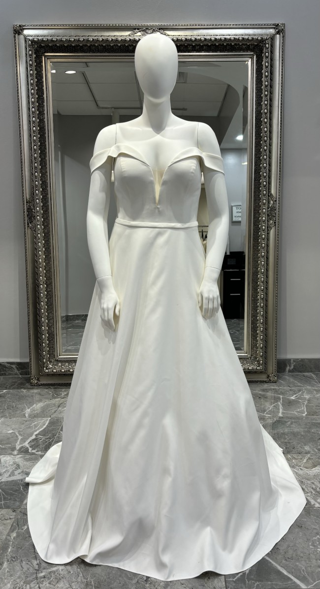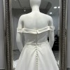 The simplicity of this off-the-shoulder gown from Essense of Australia is what makes it so glamorous and gorgeous, perfect for the classic bride. A plunging sweetheart neckline, reminiscent of an old-Hollywood style, extends effortlessly into off-the-shoulder sleeves creating a look that highlights your face beautifully. From the bodice, this structured Mikado gown extends through the hips, before flaring out into a full skirt just below the hips. Visible curved seaming highlights the gown, creating an enviable hourglass shape. A slight V adorns the back of this gown and is accented with buttons that run the length of the skirt and train. The back of this simple wedding dress zips up beneath fabric-covered buttons