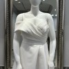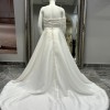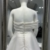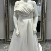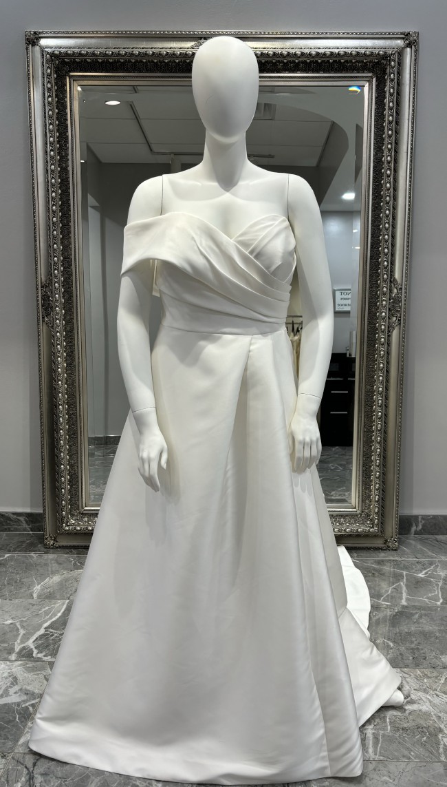 Turn heads in this dramatic and glamorous plus size wedding dress made for the fashion-forward bride. Style D3570 is constructed in the finest matte Mikado silk for a sophisticated A-line silhouette with a runway-worthy structural feel. A chic one shoulder sleeve wraps into the pleated sweetheart bodice for a modern off-the-shoulder look while a hidden split in the luxe A-line skirt adds a demure sexy allure. Finishing with a timeless elegance, fabric-covered buttons line the length of the dress from the top of the strapless bodice to the edge of the regal royal train.