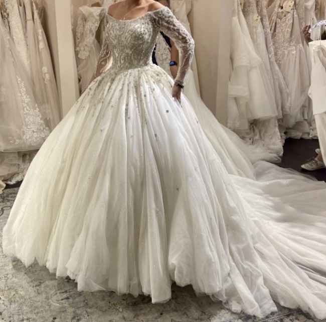 This magical ballgown is an Allure Bridal gown from the Disney Fairytale Weddings collection, which was designed to commemorate the classic animated film’s 70th anniversary. This Cinderella Platinum gown was the most expensive part of their collection, originally an $11,995 dress. It has 3/4 sleeves which come off the shoulder, a glitter tulle skirt, crystal buttons down the back (disguising the zipper), and a cathedral-length train. The bodice and sleeves are adorned with beautiful beading and crystals which flow onto the skirt and train - over 4,600 crystals and 44,000 additional sequins and beads evoking the sparkle and fantasy of the glass slipper. No flaws on the outside and no visible imperfections. There is a small amount of makeup on the inside and the slip is a little dirty on the bottom, but this won’t be visible due to the volume of the skirt. Truly a stunning dress!