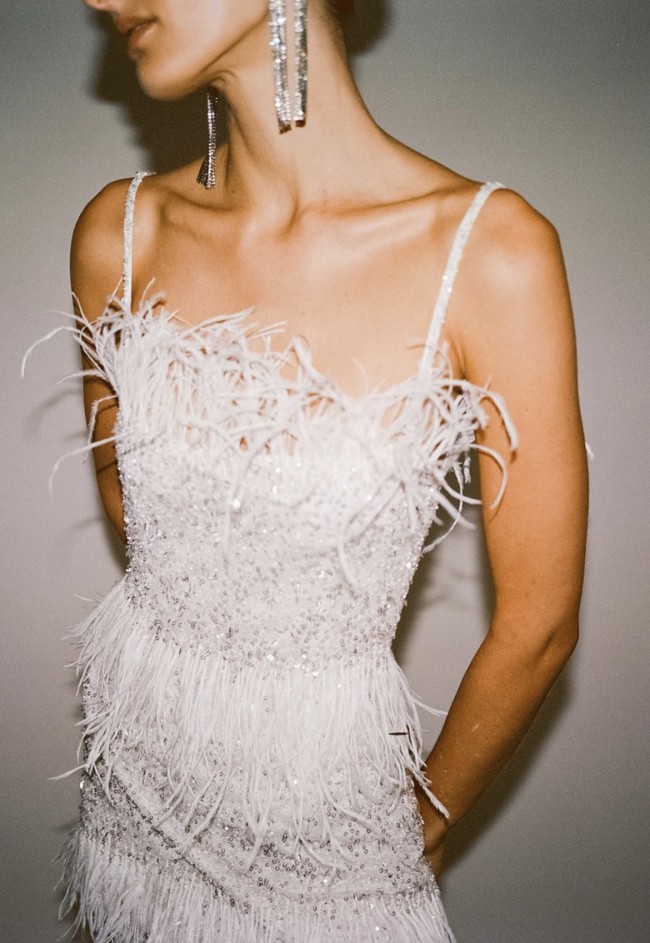 Gorgeous dress used once for a few hours as second dress for my wedding. In excellent condition. I felt like a modern day princess in this dress! Comes with additional feathers and sequins for any that may come off with wear.