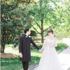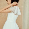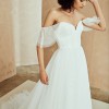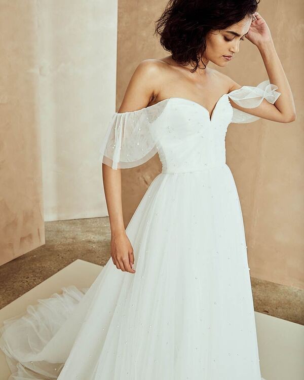 Customized Nouvelle Amsale Nicolette gown. The gown is fully embellished with pearls. The off the shoulder sleeves are detachable and there is an additional custom capelet that comes with in the same tulle with pearl embellishment. The gown is hemmed to fit someone 5’10” in heels and has the option to bustle the train in the back. It has been professionally cleaned and is in excellent condition.