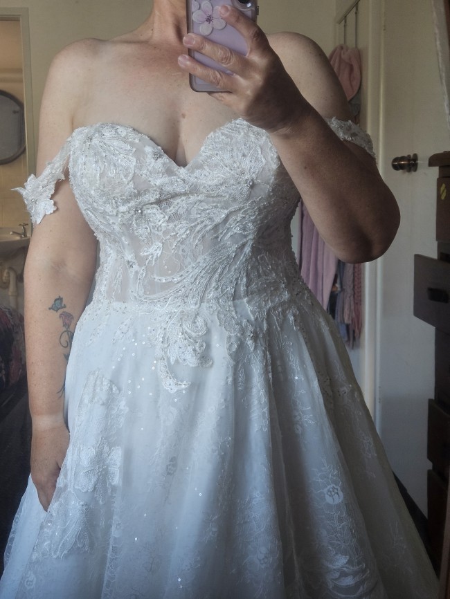 For sale is a Justin Alexander wedding dress. Ball gown style. Lots of sparkle. Straps can be worn off or on the shoulder. Sweetheart neckline. Gorgeous dress just changed my mind. Happy to post. I will also throw in a medium length veil.