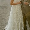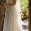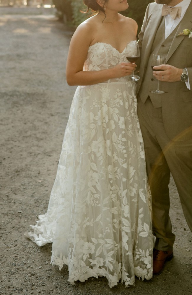 Crafted with intricate lace appliqués, the Madeline Wedding Gown features a structured, strapless bodice and removable puff sleeves for added drama.