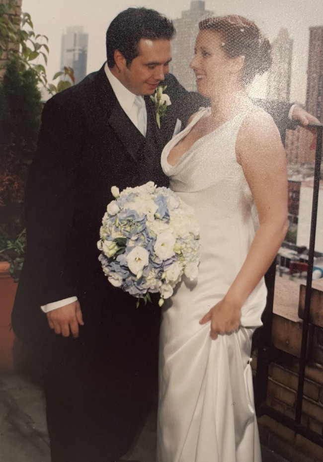 The dress is from the launch of the Reem Acra Hollywood line - it was exactly that, showstopping Hollywood Glamor. AND it is filled with the luck of a couple still married.