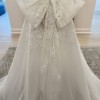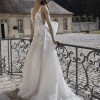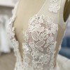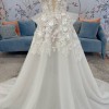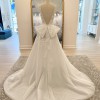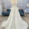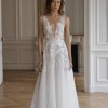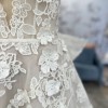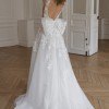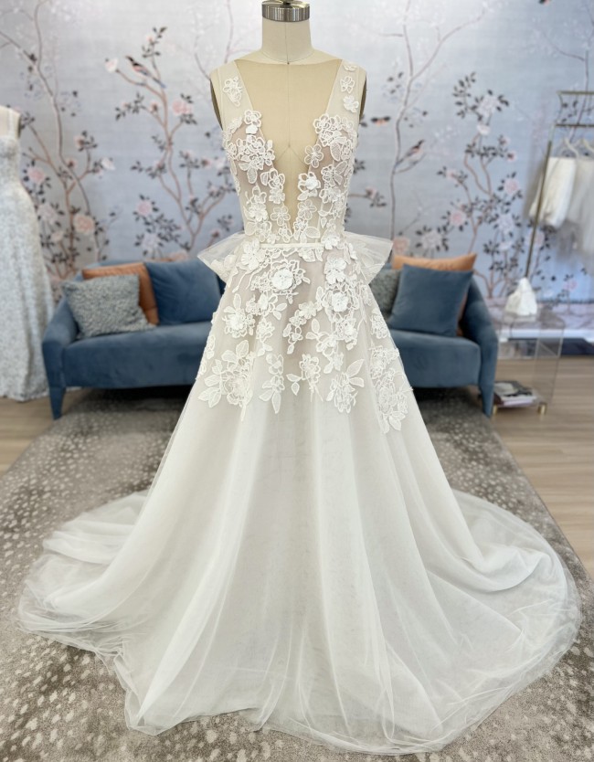 Flowy tulle gown with a deep V neckline, 3D floral lace and a lace back bow.