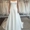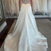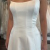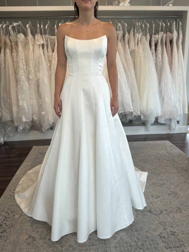 Bridal Boutique Sample in excellent condition. The Duchesse Satin scoop neckline gown features a structured bodice with multiple princess seams and ruched tulle and exposed boning back detail. Button detail to the waist completes the clean, classic yet modern look.