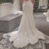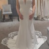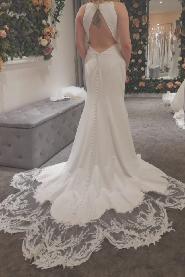 Gorgeous Maggie Sottero dress in Ivory with elegant and fitted front and beautiful button down keyhole back. The bottom flare has a stunning lace flower cut trim for all the drama and grace and detail. The flattering form of the dress is close fitting but with the inner lining and the additional modesty panel at the front it feels comfortable.