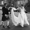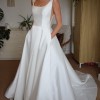 A modern twist on a traditional ball gown! Full skirt of lightweight matte Mikado. Classic silhouette, clean-cut front split with pleats. The structured bodice features a modern square neckline with wide straps. Best of all: it has pockets! Keen to sell to a UK buyer if possible.