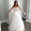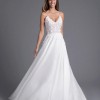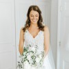A luxurious, soft A-line silk gown featuring a delicate V-neckline that is mirrored into the back. 3D floral appliqué detailing is added across the blush-toned bodice, climbing over the dainty straps for an ultra feminine touch.