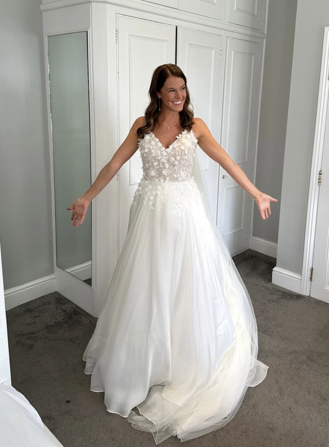 3D floral appliqué details placed delicately throughout the bodice and hip