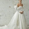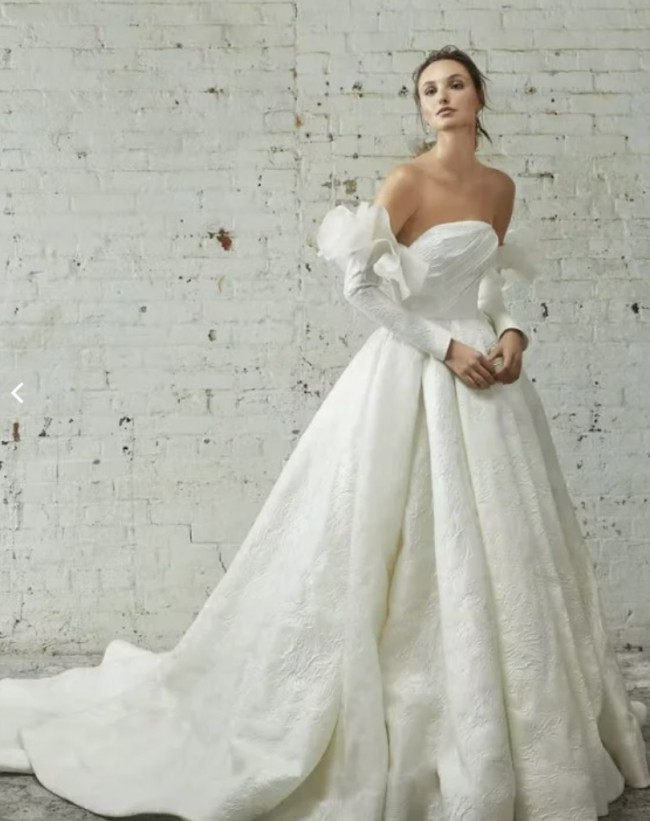 Grand pleated strapless ballgown with asymmetrically draped bodice in textured silk jacquard gazar